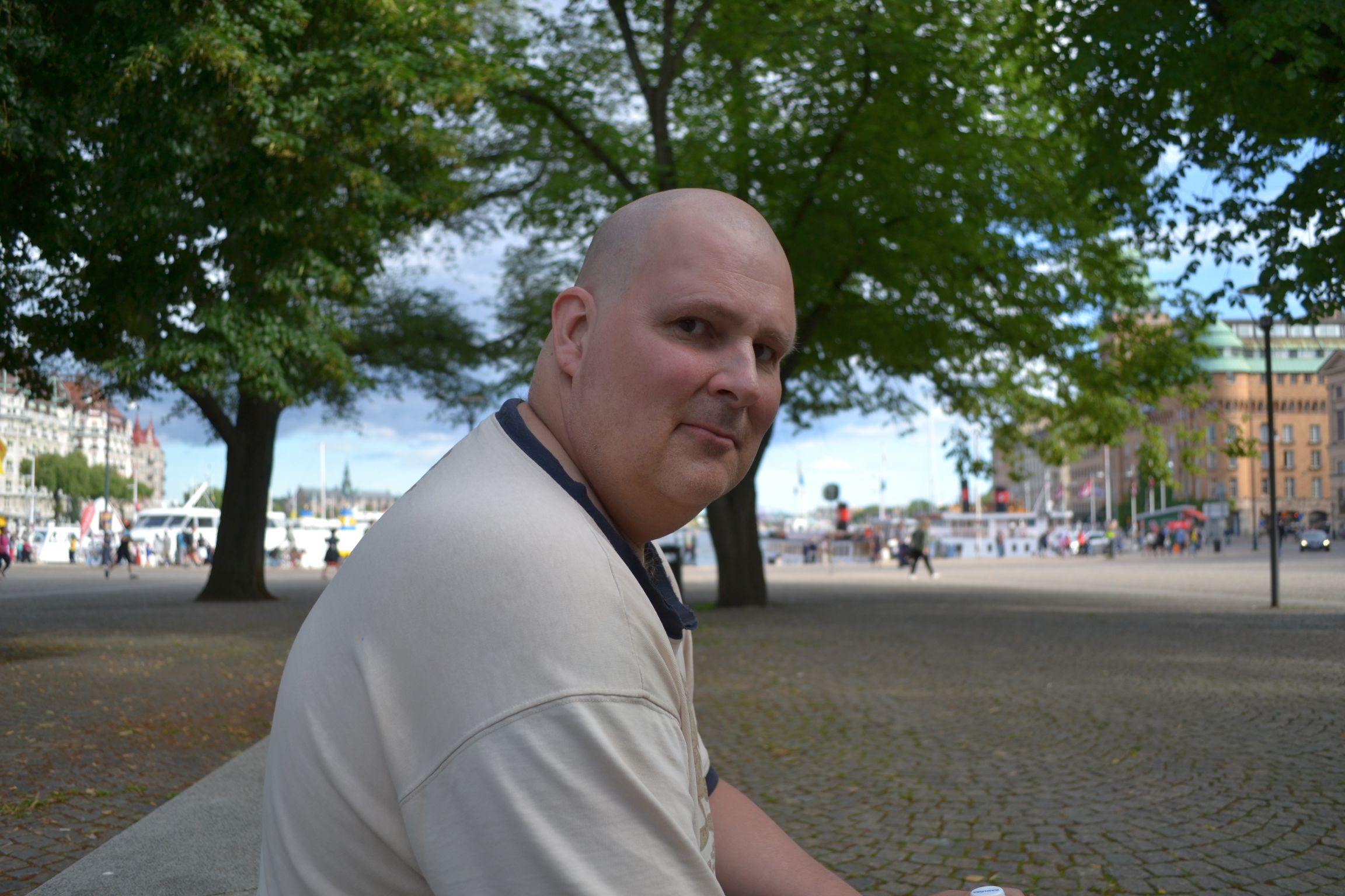 På Nybroplan. Vi tar en liten paus och njuter av det vackra vädret. Turistinfo; till vänster: Strandvägen och Nordiska muséet, bakom Uffe: Vasa, till höger: Gröna Lund och Blasieholmen.