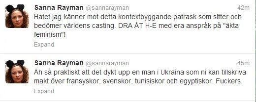 Diskussionerna lär bli invecklade; har ex vis den svenska femenattacken mot moskéen på Södermalm legitimitet som feministisk aktion om modellen den bygger på visade sig vara ett koncept styrt av en ”patriarkal” man? Sanna Rayman är dock bra när hon ryter ifrån gentemot den enda, rätta feminismens apostlar (på Södermalm). To be continued…